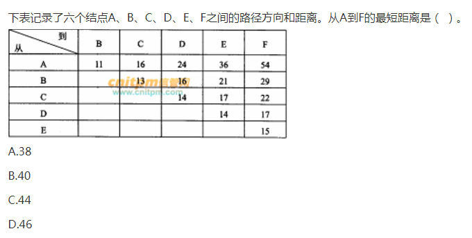 这个题,可以很简单的用穷举法试出来。先从A直接到F 是54。然后再从A到B再到F是11+29=40。最终得出A到C再到F的路径最短,为16+22=38