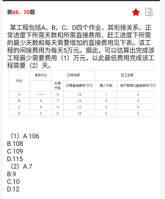 @JRS直播考友 如下思路,供参考:根据该工程各作业与紧前作业的衔接情况以及正常进度下所需的天数,可以绘制如下的进度计划网络图: 该工程的关键路径为A-C-D,正常进度的总工期为3+4+5=12天,总费用(包括12 天的间接费用)为12X5+10+15+12+18=115万元。 作业A、B、C、D赶工时,每天赶工需要分别增加费用4、2、4、2万元。而缩短总工期可以节省间接费用。如果要缩短总工期,必须先缩短关键路径上的作业时间。关键路径上最省钱赶工的作业是D。 由于A-B路径需要10天,因此只能先尝试对作业D缩短2天,总工期就可以缩短2天,可以节省间接费用2X5=10万元,但赶工作业D增加了4万元,因此合计可以节省6万元。此时,总费用为109万元,总工程为10天,关键路径有两条:A-B和A-C-D。 然后尝试对作业B和作业D各缩短1天。关键路径不变。总工期减少1天,间接费用节省5万元,但赶工B和D各1天需要增加费用4万元,所以还能节省1万元。此时,总费用为108万元,总工期为9天。 再尝试对作业A缩短2天,节省间接费用10万元,但增加赶工费用8万元,还能节省2万元。此时,关键路径为A-B和A-C-D,总工期为1+6=7天,总费用为106 万元。 现在,作业B还能缩短3天,作业C还能缩短2天。总工期只能再缩短2天。作业B和C每缩短1天,即总工期每减少1天,间接费用节省5万元,而作业B和C的赶工将增加费用6万元,并不合算。 所以,该工程最低费用的进度计划网络图如下: 此时,总费用为106万元,总工期为7天。