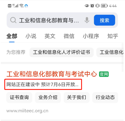 目前这两个网站都打不开,很多考友预计软考办官网7月2日会恢复正常,但截至目前为止,软考办官网仍然显示“系统正在维护中......”,不过当小编搜索工业和信息化部教育与考试中心官网的时候有显示”网站正在建设中,预计7月6日开放“(如下图所示)。这是不是意味这软考办官网也要到7月6日左右才回恢复呢?我们不得而知,只能耐心等待。