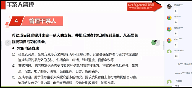 拉式沟通。用于信息量很大或受众很多的情况。要求接收者自主自行地访问信息内容。这种方法包括企业内网、电子在线课程、经验教训数据库、知识库等。