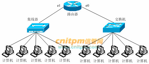3、 在下图的网络配置中,总共有 (1) 个广播域, (2) 个冲突域。