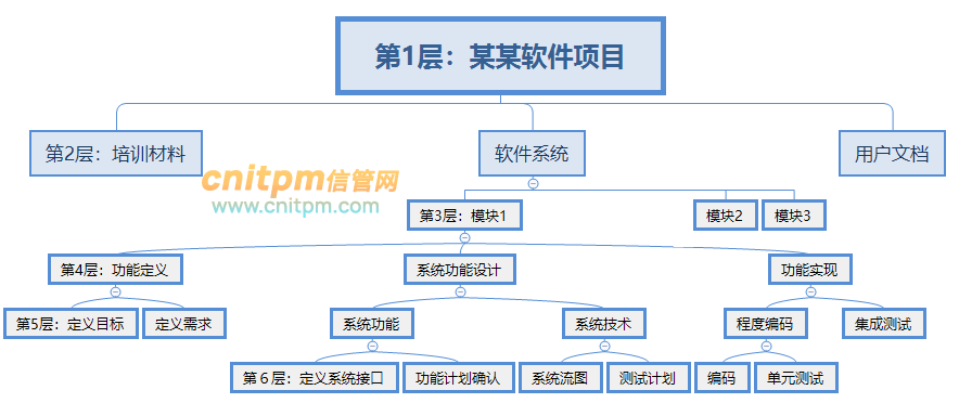 在2021年上半年信息系统项目管理师论文题目论信息系统项目范围管理里有一个要求就是3.请结合你所叙述的项目范围和需求跟踪矩阵,给出项目的WBS。(要求与描述项目保持一致,符合WBS原则,至少分解至5层),要求WBS分解到5层,很多同学由于没有项目管理经验,同时教材上也大多只给出了3层结构,就不知道怎么写了,就感觉这个该怎么分解呢,其实这个很容易,就看细分了,比如你可以分模块1、模块2,然后又分子模块1、子模块2,然后再分子模块1功能1、子模块1功能2 等等,下面就是一个5层WBS的实例供参考。