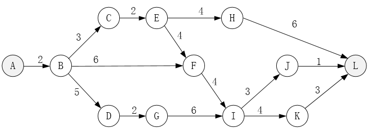某软件项目的活动图如下图所示,其中顶点表示项目里程碑,连接顶点的边表示包含的活动,边上的数字表示活动的持续天数,则完成该项目的最少时间为(9)天。活动EH和IJ的松弛时间分别为(10)天。