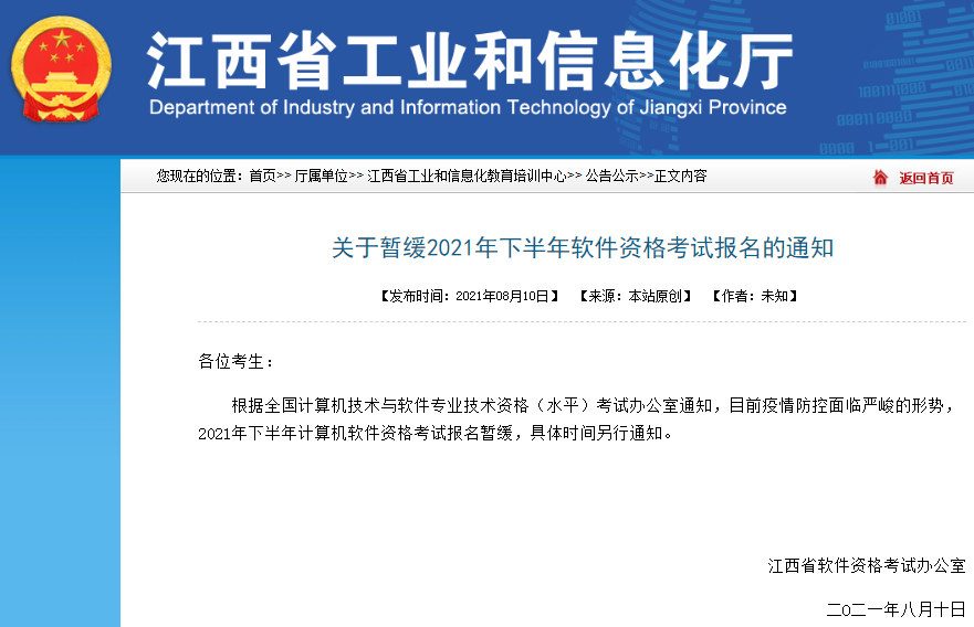 通过江西省工业和信息化厅发布的通知得知,目前疫情防控面临严峻的形势,受防疫工作需要,江西2021年下半年软考考试报名工作将暂缓,原定于2021年8月10日9点至9月8日17点的报名时间将推迟,具体时间另行通知,请考生关注江西软考办消息,以免错过考试报名。
