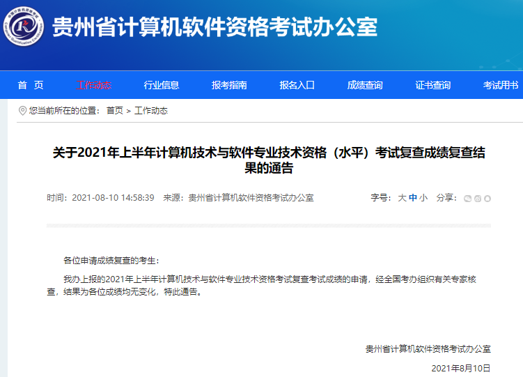 通过贵州省计算机软件资格考试办公室官网了解得知,目前“关于2021年上半年计算机技术与软件专业技术资格(水平)考试复查成绩复查结果的通告”现已发布,经全国考办组织有关专家核查,贵州2021年上半年软考成绩均无变化,以下为官网通知原文: