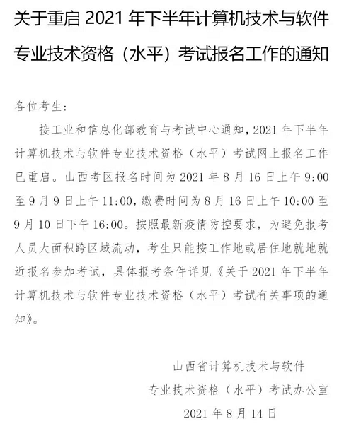 关于重启2021年下半年计算机技术与软件专业技术资格(水平)考试报名工作的通知