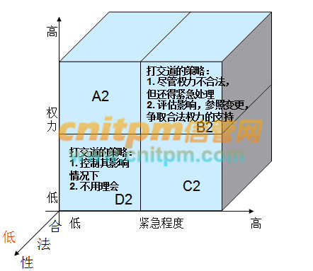 以B2区的干系人为例:这类干系人权力高,但合法性低,所涉及的事项很紧急。例如B市信息中心正在为市政府的电子政务项目布设光缆,此时电力公司闻讯后紧急叫停了光缆的施工,叫停的理由是:光缆离他们的设施过近。但光缆和市政电力设施要多远?其实没有一个确切的说法,电力公司内部的标准也没有得到信息中心的认可。为了赶工期,信息中心继续施工,此时电力公司威胁要断电。如果你是项目经理,你如何处理此类棘手的问题?