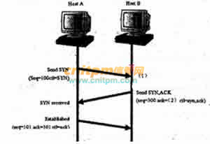 3、 下图中主机a和主机b通过三次握手建立tcp连接,图中(1)处的状态是(1) ,图(2)处的数字是(2) 。