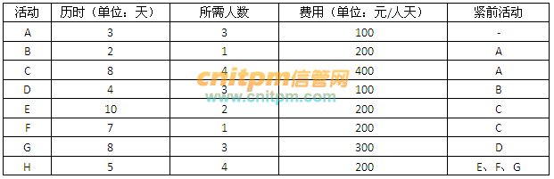 已知某信息工程由A、B、C、D、E、F、G、H八个活动构成,项目的活动历时,活动所需人数、费用及活动逻辑关系如下表所示