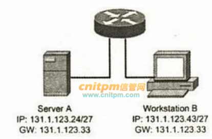 2、参加下图的网络配置,发现工作站b无法与服务器a通信,什么故障影响了两者互通?( )。