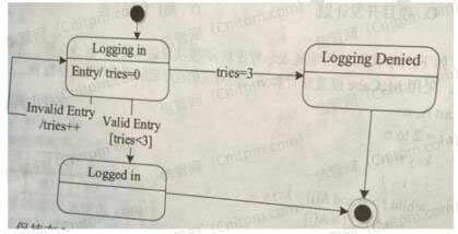 41~43、某软件系统限定:用户登录失败的次数不能超过3次。采用如所示的UML状态图对用户登录状态进行建模,假设活动状态是Logging in,那么当Valid Entrty发生时,(1)。 其中,[tries<3]和tries+ +分别为(2)和(3)。