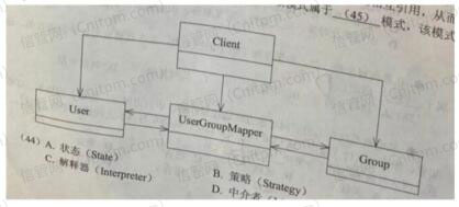 44~46、在某系统中,不同组(GROUP)访问数据的权限不同,每个用户(User)k可以是一个火多个组中的成员,每个组包含零个或多个用户。现要求在用户和组之间设计映射,将用户和组之间的关系由映射进行维护,得到如下所示的类图。该设计采用(1)模式,用一个对象来封装系列的对象交互;使用户对象和组对象不需要显式地相互引用,从而使其耦合松散,而且可以独立地改变它们之间的交互。该模式属于(2)模式,该模式适用: (3)。