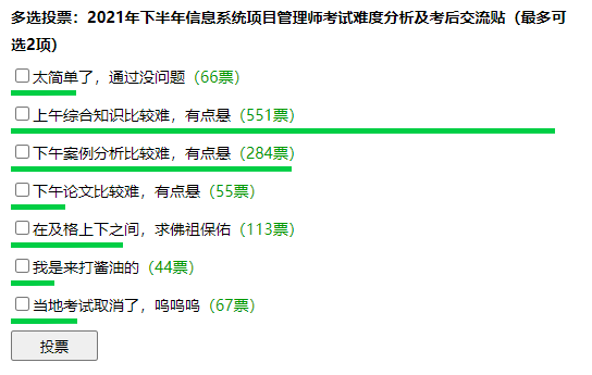 以下是关于2021年下半年信息系统项目管理师考试难度的一个投票,从投票数据上来看,很多考生认为该考试还是比较难的。
