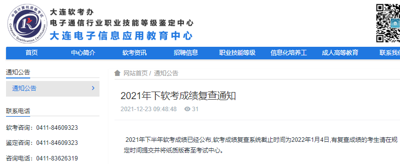 根据大连电子信息应用教育中心发布的《2021年下软考成绩复查通知》,辽宁大连2021年下半年软考成绩复查截止时间为2022年1月4日,对成绩有异议的考生请在规定时间内提交并将纸质版寄至考试中心。详情请见通知原文: