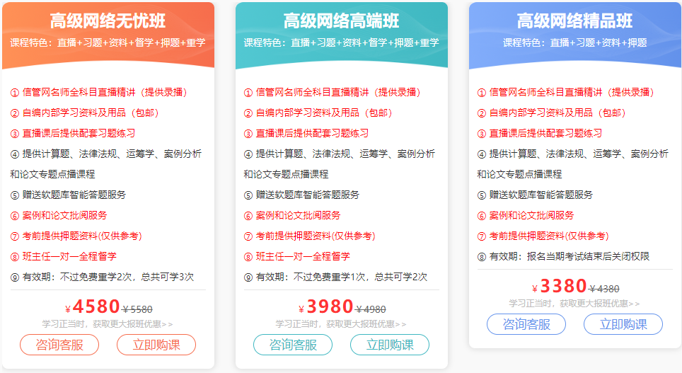 JRS直播软考学院专注课程体系完善,全科精讲+重点难点串讲+案例专题辅导+考前冲刺串讲等课程内容全方面助力于学员学习。针对不同考生需求,JRS直播特开设了高端班、精品班、无忧班多种学习套餐可供考生选择,考生们可以根据个人实际情况和需要进行报名。