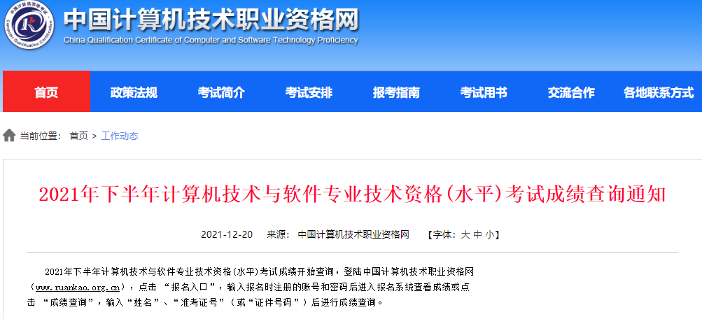 2021年下半年计算机技术与软件专业技术资格(水平)考试成绩查询通知