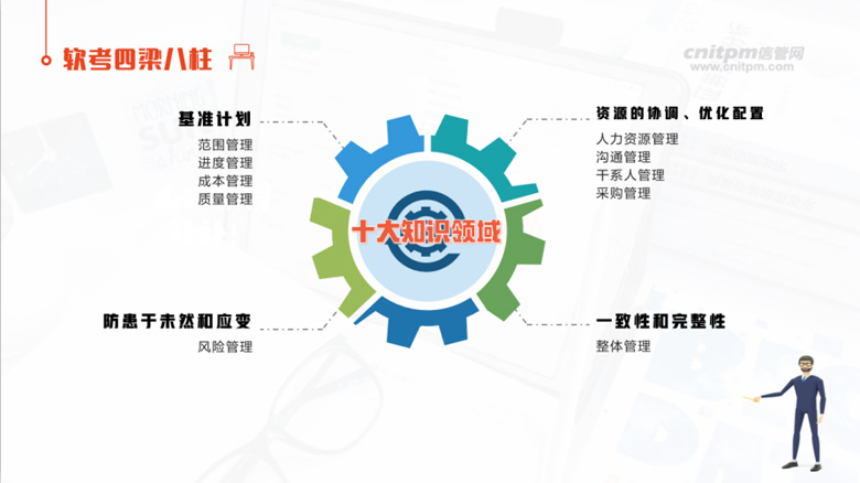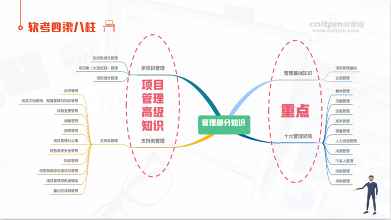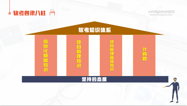 倪昇阳老师创四梁八柱教学体系,将软考知识点分解为信息化基础知识、项目管理知识、项目管理高级知识和计算题四大类型,通过思维导图及形象化的形式对各个知识点进行讲解。[立即试听]