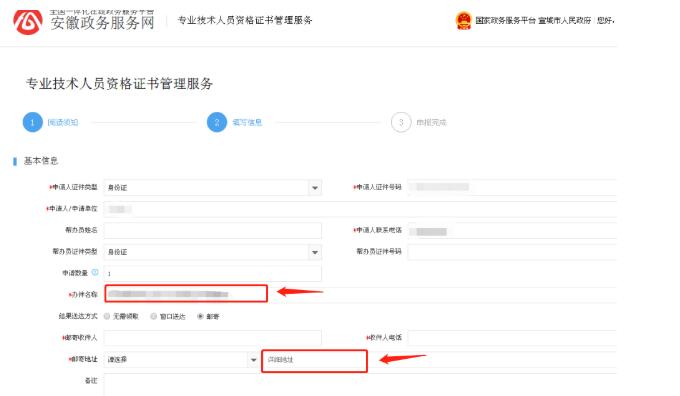 5.填写相关信息,注意办件名称格式为:“年份+xx证书”,如2020年二级建造师证书;地址请详细填写;