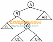 下图所示平衡二叉树(树中任一结点的左右子树高度之差不超过1)中,结点A的右子树AR高度为h,结点B的左子树BL高度为h,结点C的左子树CL、右子树CR高度都为h-1。若在CR中插入一个结点并使得CR的高度增加1,则该二叉树 ( ) 。
