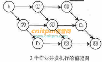某计算机系统中有一个CPU、一台输入设备和一台输出设备,假设系统中有3个作业T1、T2和T3,系统采用优先级调度,且T1的优先级>T2的优先级>T3的优先级。若每个作业具有3个程序段:输入Ii、计算Ci和输出Pi(i=1,2,3),执行顺序为Ii、Ci、Pi,则这3个作业各程序段并发执行的前驱图如图1-2所示。图中①、②分别为(1),③、④分别为(2),⑤、⑥分别为(3)。