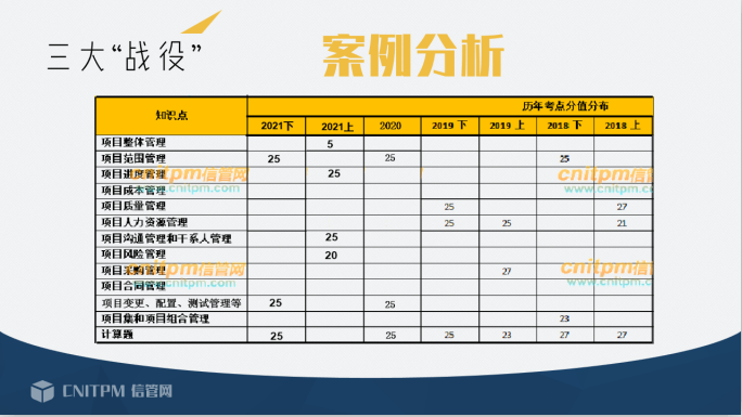1.深度分析综合知识、案例分析出题规律,传授解题思路、应试技巧。对综合知识与案例分析考试重点(网络图、挣值计算、十大管理领域等)以及主要考试题型(计算题、分析题)进行专业讲解,深度强化。