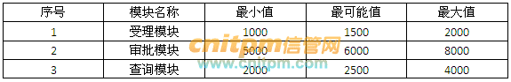 某软件开发项目拆分成3个模块,项目组对每个模块的开发量(代码行)进行了估计(如下表),该软件项目的总体规模估算为()代码行