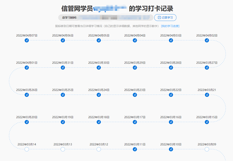 1、截图21天打卡记录,打卡记录地址:https://m.fzyzx.cn/jindu/StudySpeed.aspx
