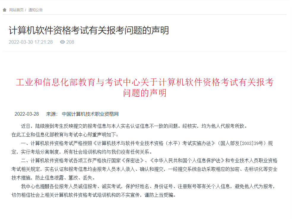 近日,陆续接到考生反映提交的报考信息与本人实名认证信息不一致的问题。经核实,均为他人代报考所致。大连市考试中心也提醒各位报考人员诚信报考、诚实考试,保护好姓名、身份证号、注册账号等有关个人信息,避免他人代为报考,切勿相信社会上相关计算机软件资格考试培训机构的不实宣传,谨防上当受骗。