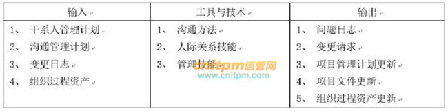 (1)概念:在整个项目周期中,与干系人进行沟通与协作,以满足他们的需求与期望。解决实际出现的问题,并促进干系人合理参与的过程。这个过程帮助项目经理提升来自干系人的支持,并把干系人的抵制降到最低。从而显著提高项目成功的机会。