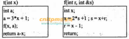 函数t()、f()的定义如下所示,若调用函数t时传递给x的值为5,并且调用函数F()时,第一个参数采用传值(call by value)方式,第二个参数采用传引用(call by reference)方式,则函数t的返回值为( ) 。