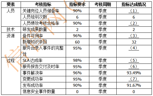 1.33.33%,2.92.31%,3.96.67%,4.95.7%5.88.82%6.80%7.83.33%<br>2.人员方面需要重视关键岗位人员储备率有待提高,人员能力评价管理,考核绩效管理方面,资源方面新增知识条目不足,知识库管理方面需要加强,过程管理方面需要sla达成率,服务报告管理有待提高,事件管理,变更管理,安全管理,连续性管理,可用性管理等方面<br>3.人员要素管理可能遇到的风险有