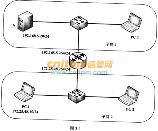 某公司网络划分为两个子网,其中设备 A 是 DHCP 服务器,如图 3-1 所示。