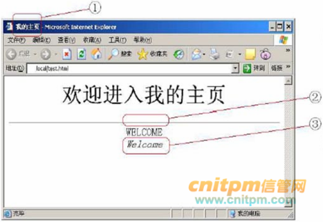 5、 下图是 html 文件 test.html 在 ie 中的显示效果,实现图中①处效果的 html 语句是(1),实现图中②处效果的 html 语句是(2),实现图中③处效果的 html 语句是(3)