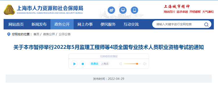 根据新冠肺炎疫情防控工作有关要求,为确保广大应试人员生命安全和身体健康,经研究决定,暂停上海地区原计划于2022年5月举行的监理工程师、注册建筑师(一、二级)、环境影响评价工程师、计算机技术与软件(上半年初、中、高级)等4项全国专业技术人员职业资格考试。