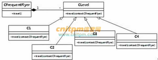 图3-2所示的类图中使用了那种设计模式?在这种设计模式下,类CFrequentFlyer必须具有的属性是什么?C1-C4中的travel方法应具有什么功能
