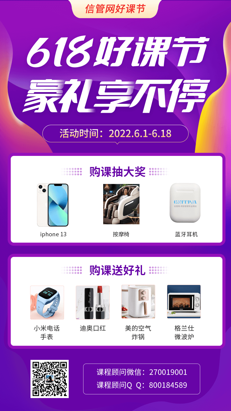 本次6.18除了满额赠送¥1000元/¥2000购课优惠劵之外,凡是在活动期间购买课程的学员即赠送精美礼品一份,还能享有抽取大奖的机会一次,还有iphone13等你来抽。