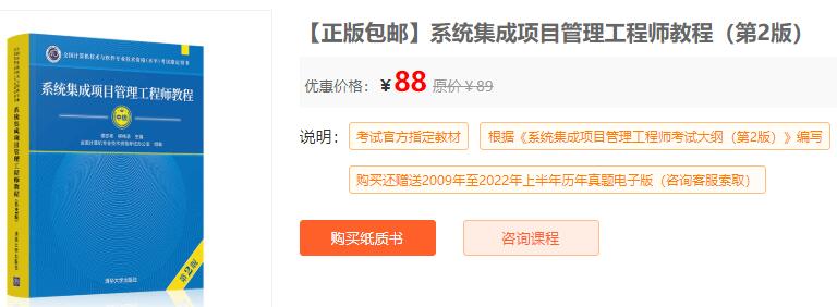 系统集成项目管理工程师教程(第2版)目前在【JRS直播书店】有售,售价108元,保证为正版官方用书。同时除原书籍之外,在JRS直播书店购买该教程的用户,我们还将免费赠送2009年至2022年上半年系统集成项目管理工程师真题电子版,达到“读写结合,熟悉往年考情”,帮助考生更好的进行备考。
