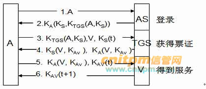 Kerberos由认证服务器(AS)和票证授予服务器(TGS)两部分组成,当用户A通过Ketberos向服务器V请求服务时,认证过程如下图所示,图中①处为(1),②处为(2)。