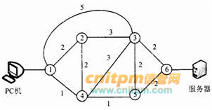 网络由6个路由器互连而成,路由器之间的链路费用如下图所示,从PC机到服务器的最短路径是 (1) ,通路费用是 (2) 。