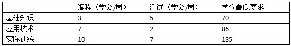 某IT企业计划对一批新招聘的技术人员进行岗前脱产培训,培训内容包括编程和测试两个专业,每个专业要求在基础知识、应用技术和实际训练三个方面都得到提高。根据培训大纲,每周的编程培训可同时获得基础知识3学分、应用技术7学分以及实际训练10学分;每周的测试培训可同时获得基础知识5学分、应用技术2学分以及实际训练7学分。企业要求这次岗前培训至少能完成基础知识70学分,应用技术86学分,实际训练185学分。以上说明如下表所示: