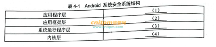 在Android系统提供的安全措施中有安全沙箱、应用程序签名机制;权限声明机制、地址空间布局随机化等,请将上述四种安全措施按照其所在层次分填入表4-1的空(1)-(4)