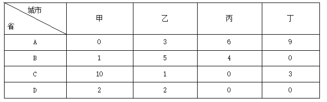 有 A、B、C、D 四个临省,同时向甲、乙、丙、丁四个城市运送援助物资,假设规定一个省对口援助一个城市。四省到各城市的运输时间如下表所示。请给出一个合理的方案,使得物资运输总时间最短,则最短物资运输时间为()时。