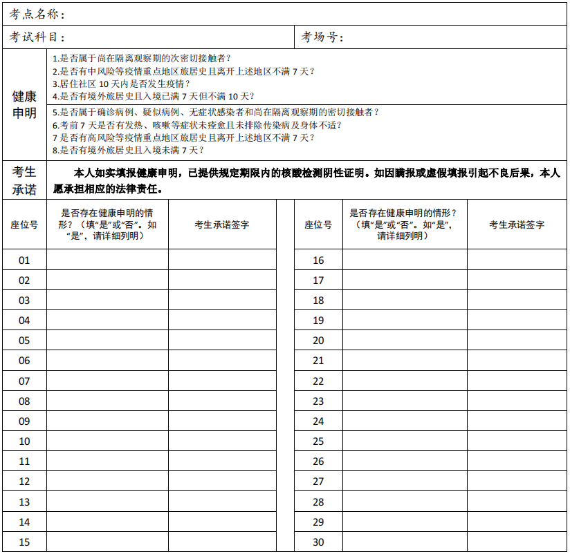 注:“健康申明”中 1-4 项为“是”的,考生须向考点所在市人事考试机构申报,并携带规定的健康证明,在隔离考场考试;