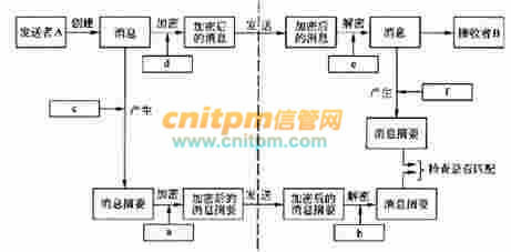 图3-2描述了发送和接收消息的过程,其中的认证过程使用了图3-1中的方法。图3—1中的方框a和方框b与图3-2中的方框a和方框b相同。