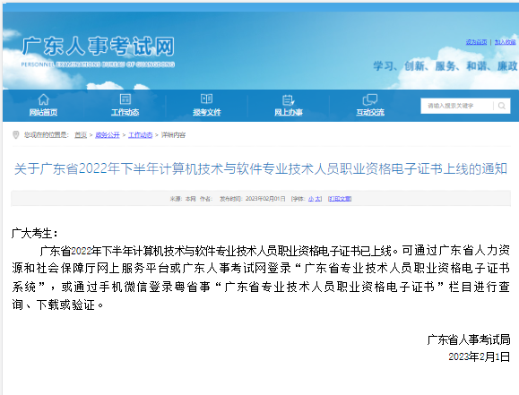 虽然前几天广东部分考生可以下载打印2022年下半年软考电子证书,但很多考生还是没办法下载打印的,广东人事考试网也一直没有发布相关通知。2023年2月1日广东人事考试网(http://rsks.gd.gov.cn/)终于发布了《关于广东省2022年下半年计算机技术与软件专业技术人员职业资格电子证书上线的通知》,自2023年2月1日起,广东2022年下半年软考合格人员皆可下载打印电子证书了。