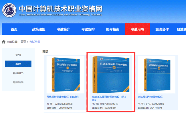 信息系统项目管理师教程第4版于2023年3月1日出版,由于软考办官网没有发相关通知,所以考生有点把握不住2023年上半年信息系统项目管理师会不会用第4版教程,那么现在软考办官网更新了网站考试用书栏目,其中信息系统项目管理师教程为第4版,这么看来,上半年应该是用第4版了。