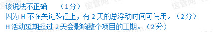 问题:根据项目经理的预测,H活动是项目组面临的一个新问题,一旦延期将会影响到整个项目的工期,这种说法对吗?为什么? 如果不对,其延期几天会影响整个项目的工期?