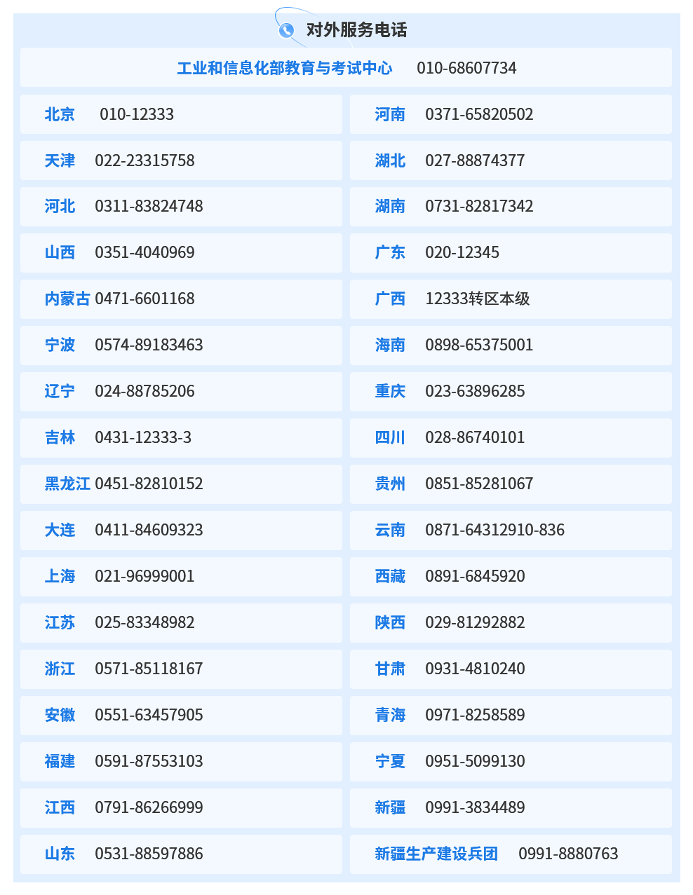 2023年最新各地软考办联系电话汇总,各地信息系统项目管理师考试考点联系电话、系统集成项目管理工程师考点联系电话、系统规划与管理师考点联系电话、信息安全工程师考点联系电话。
