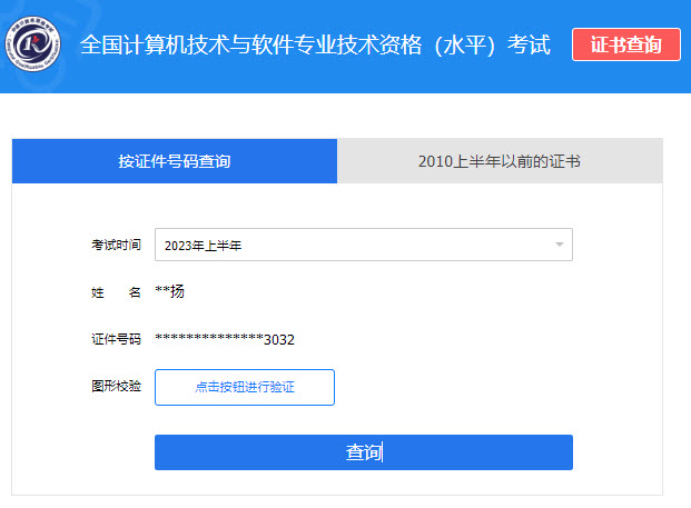 4、选择考试时间为2023年上半年、进行图形校验,然后点击查询即可
