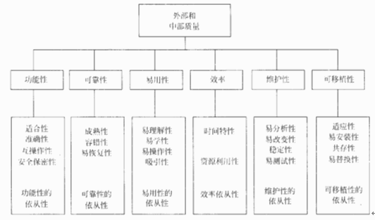 《软件工程产品质量》(GB/T 16260.1-2006中定义了内部和外部质量的质量模型。它将软件质量划分为6个特性(功能性、可靠性、易用性、效率、维护性、可移植性,并进一步细分为若干个子特性。这些子特性可用内部或外部度量来测量。软件质量特性包括: